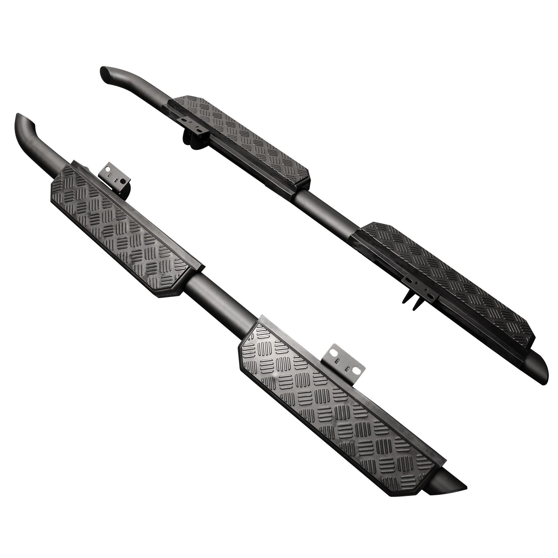 Crafted with a distinctive chequer plate finish in stealth black, these side steps provide both practical benefits and visual enhancement. The textured surface is designed to offer reliable grip in all weather conditions, while the robust construction is built to withstand the demands of off-road adventures and daily use.